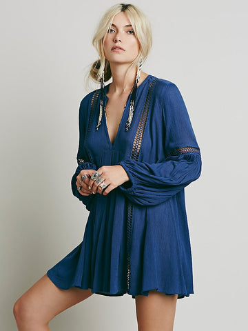 Crinkly babydoll style swing tunic featuring crochet insets and pleat detailing. V-neckline and elastic cuffs complete the look.