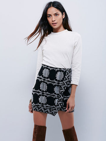 Geo-patterned sweater mini skirt with asymmetrical seam detail and a stretch waistband.
