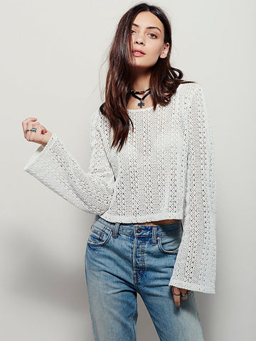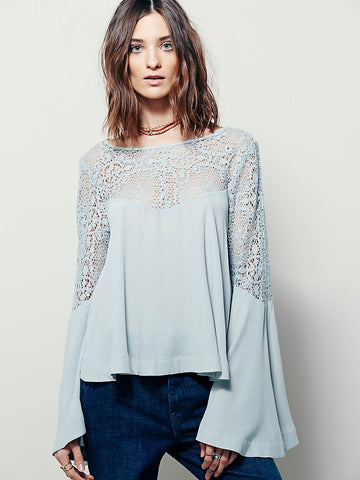 Beautiful, swingy top featuring sheer crochet detail along the neckline and sleeves. Cutout at the back with button closure. Wide bell cuffs.